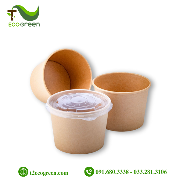 Bát (tô) giấy nâu kraft dùng 1 lần có nắp PP 350ml (12oz)