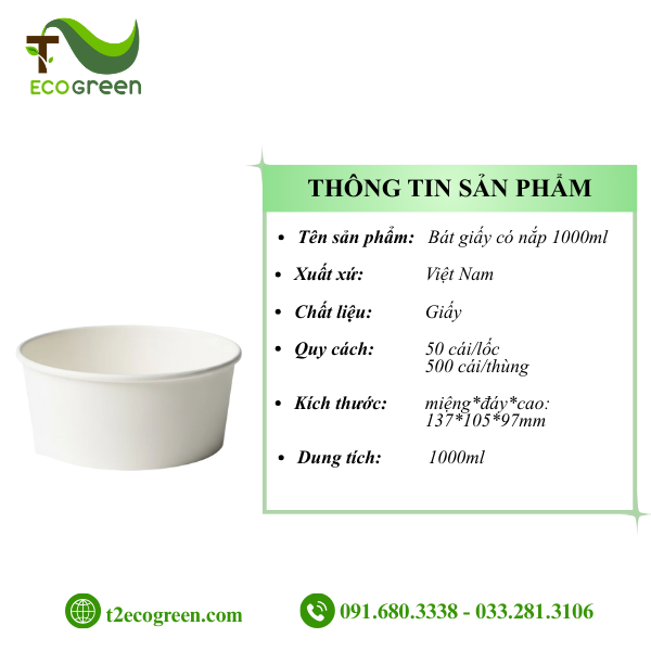 Bát (tô) giấy trắng dùng 1 lần có nắp PP 1000ml (32oz)