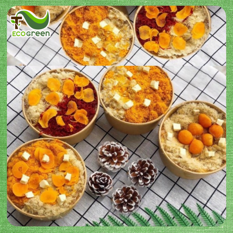 Hộp giấy tròn kraft có màu nâu vàng của giấy kraft, kèm theo nắp trong suốt. Hộp có độ chắc chắn và cứng cáp vô cùng cao. Được sử dụng để đựng nhiều loại thực phẩm như bánh tiramisu, cheesecake, bông lan trứng muối, bánh kem kết hợp với trái cây.