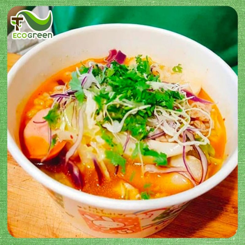 - Bên trong lòng tô phải có lớp lót PE hữu cơ – một loại nhựa dẻo giúp lưu giữ nhiệt độ món ăn và ngăn nước dùng thấm qua giấy chảy ra bên ngoài.
